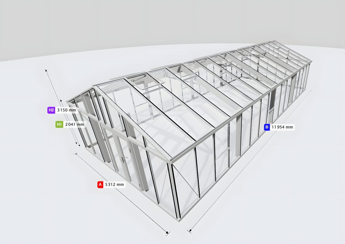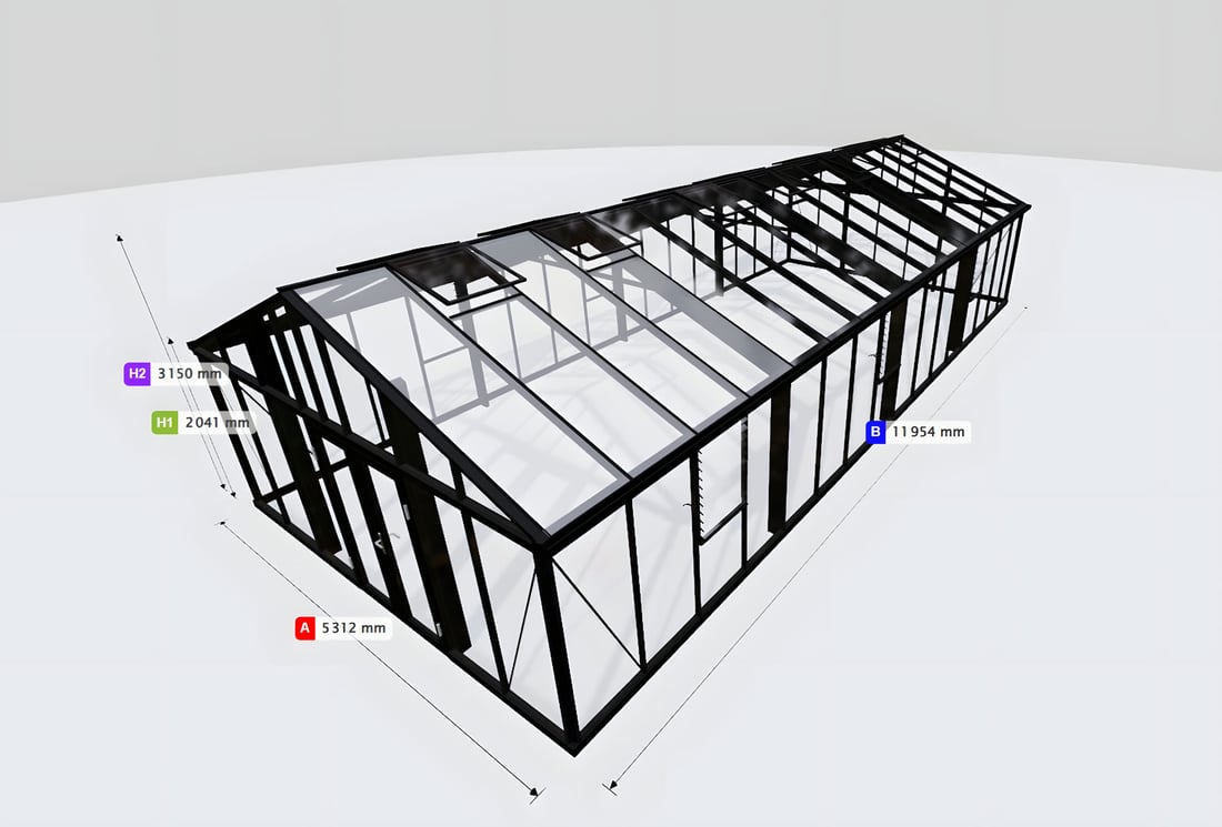 As Janssens' largest greenhouse range, available up to 6 meters wide and 18 meters long in 2ft increments, it offers vast growing space for year-round cultivation, while its striking industrial aesthetic and high ridge height make it equally suited to entertaining, exhibitions, or as a pool canopy.