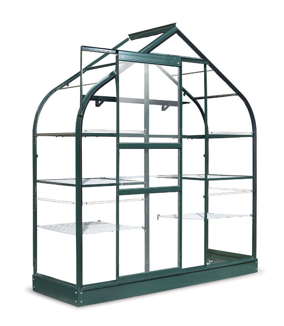 This Supreme Wall Garden has a single opening roof vent for ventilation, a smooth single sliding door and a full range of shelves to house your plants. The green powder coated finish lets the greenhouse blend in with the surroundings in your garden while protecting the aluminium frame from the elements.