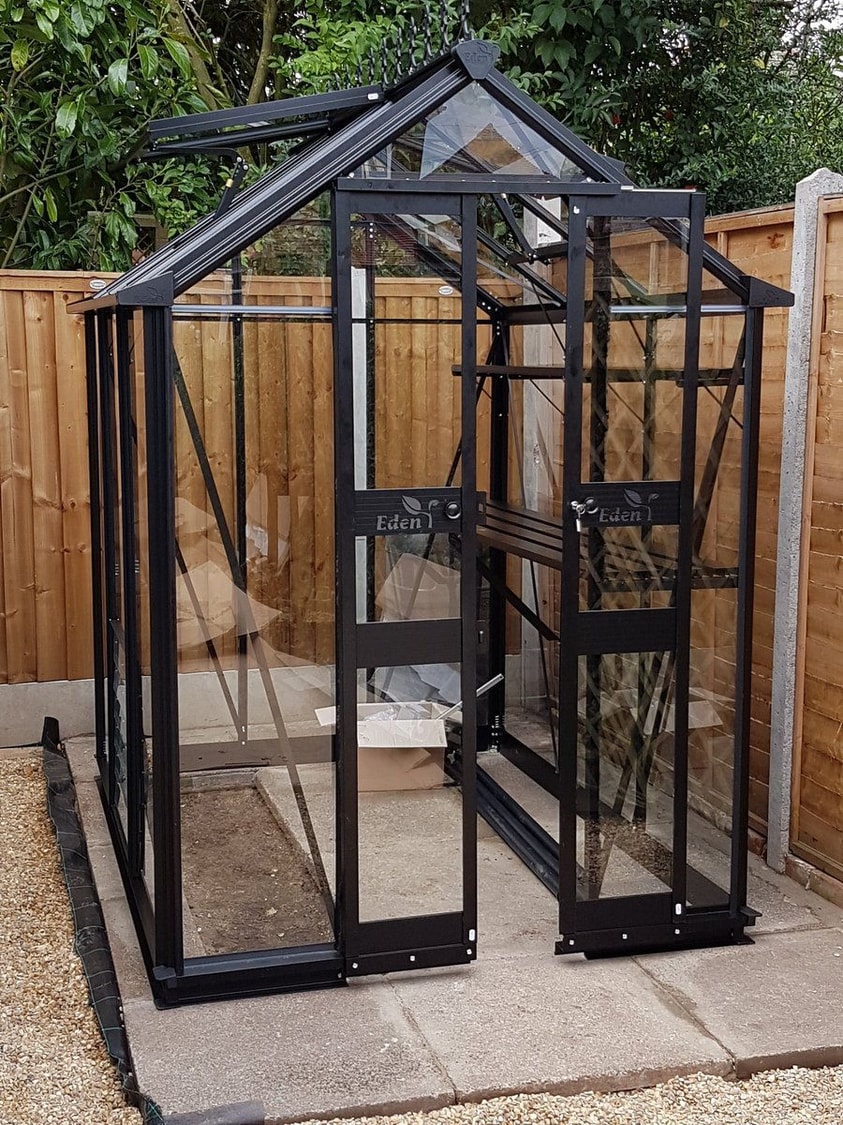 The UK manufactured Halls Cotswold Birdlip 4x6 Greenhouse with a black powder coated finish with 3mm toughened safety glass is the very latest small greenhouse from Eden with it`s superb design features like the no threshold entrance and glazing bar capping.