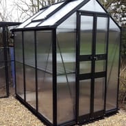 The UK manufactured black framed Halls Cotswold Birdlip 4x6 Greenhouse model with polycarbonate glazing is perfect for a family garden where safety is a priority and children are playing. Polycarbonate is shatterproof and totally safe.