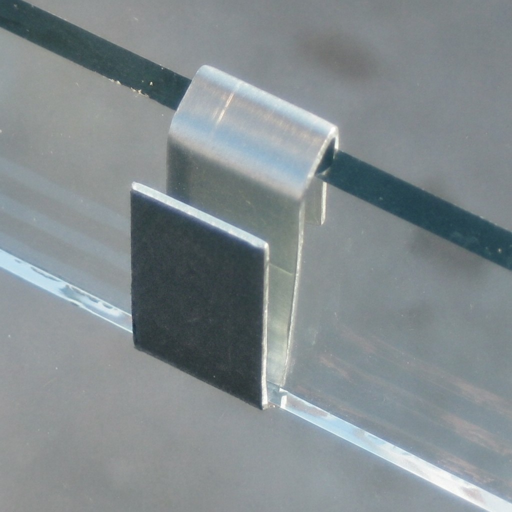 On any greenhouse with overlapping glazing, the overlap clips are what stop the upper pane from sliding down. We always carry spare overlap clips on installation jobs because they are the most commonly needed replacement part. The Z-shaped profile locks the two glass edges together at the joint.