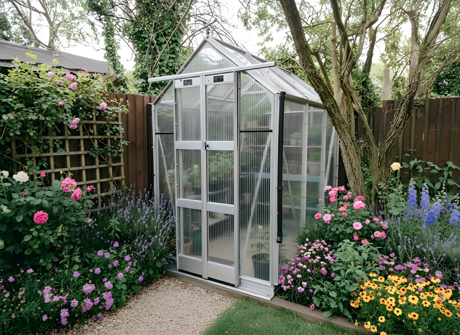 Add an additional set of Plain Aluminium Doors to the rear of your greenhouse.