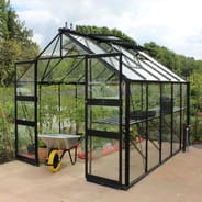 The UK manufactured black powder coated Halls Cotswold Blockley 8x10 Greenhouse with 3mm toughened safety glass and the new âno threshold" entrance is ideal for gardens and allotments.