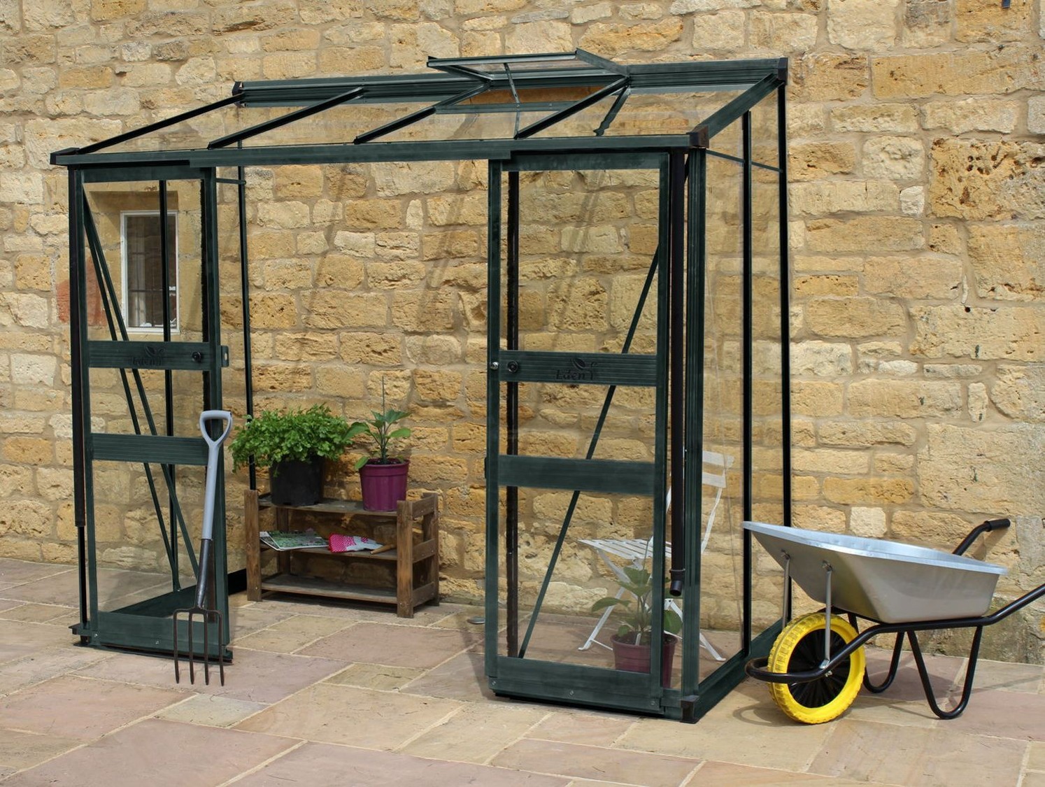 The UK Manufactured Halls Cotswold Broadway Green 4x8 Lean to Greenhouse with toughened safety glass is the latest low ridge height lean to from Eden with unique design features like the no threshold entrance and bar capping.