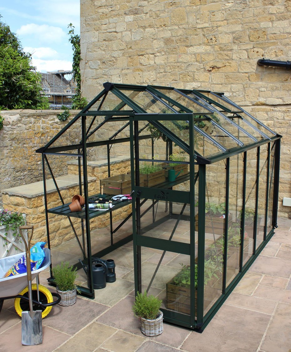 The UK manufactured green powder coated Halls Cotswold Burford 6x6 Greenhouse with 3mm toughened safety glass and the new âno threshold" entrance is perfect for family gardens or allotments. It`s tough, smart and will blend into your garden perfectly.