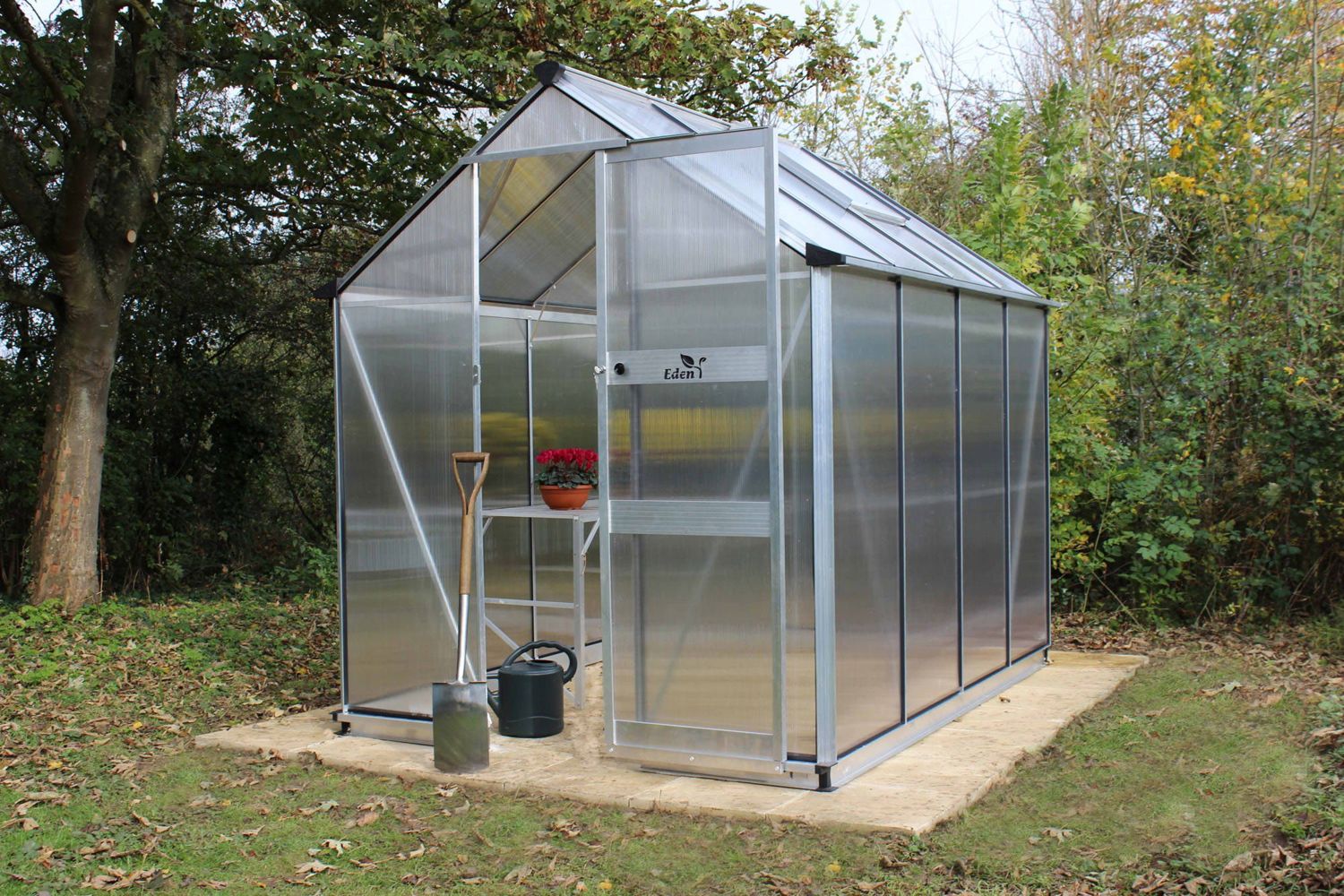 The UK manufactured silver Halls Cotswold Burford 8x6 Greenhouse with shatterproof 6mm polycarbonate glazing, is safe for family gardens and gives great insulation all year round to your plants.