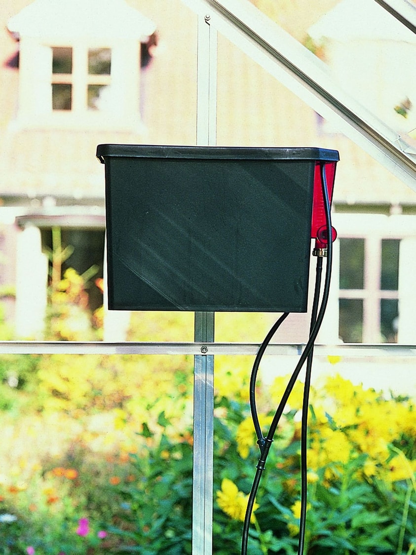 The Vanlet Auto Irrigation Unit sits up high in your greenhouse and feeds water down little plastic hose pipes to your plants.
