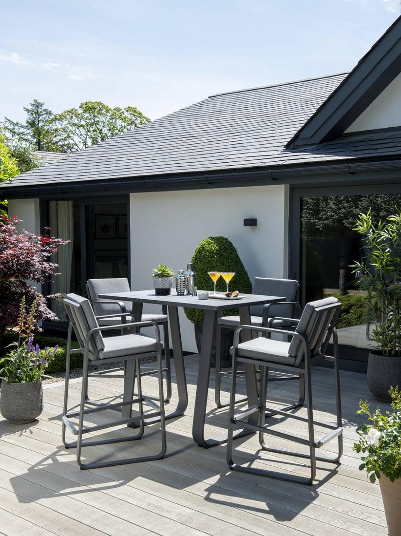 The 4 Seat Babingley Outdoor Bar Set is made from Powder Coated rust-resistant aluminium to create long-lasting and comfortable Garden Furniture that can be left outside all year round. The comfortable deep-filled cushions are made from a combination of Polyester and Acrylic.