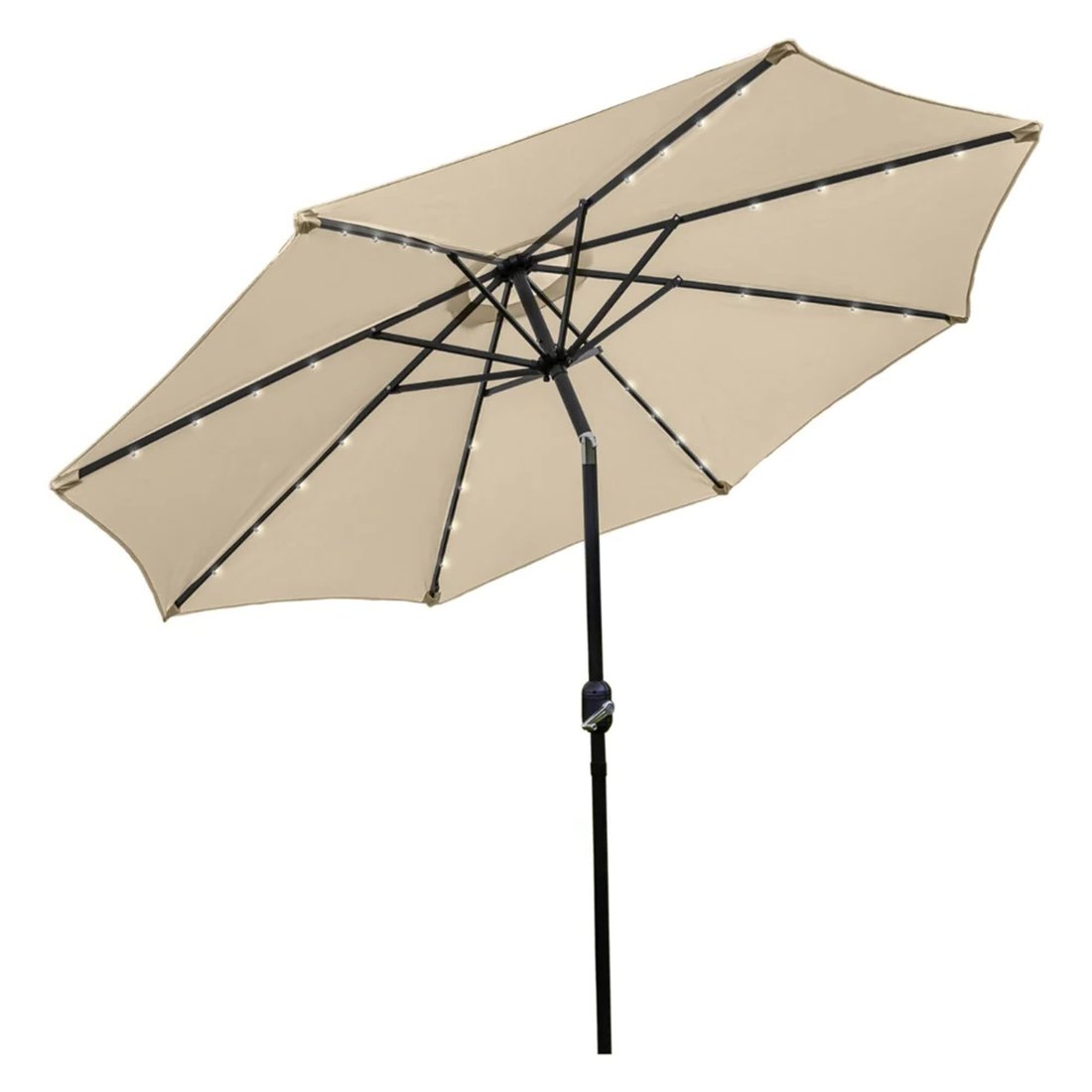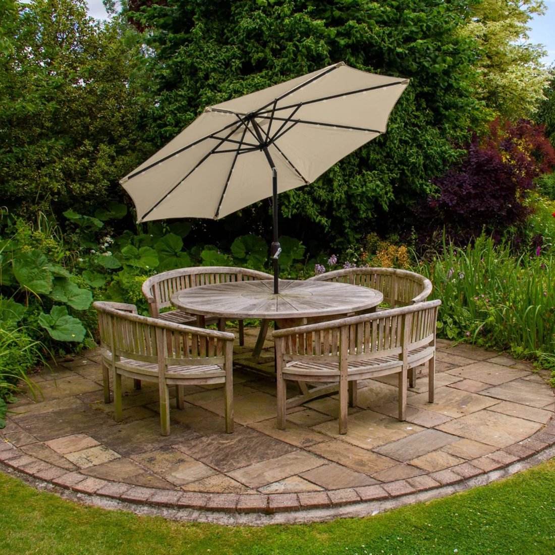 The Lichfield Beige 2.7m Tilt Parasol with LEDs ia an innovative parasol that caters to your every need. Effortlessly tilt it to your desired angle for optimal coverage or rotate it a full 360 degrees for unparalled shading control, accompanying the sun's movements throughout the day. Its sleek central pole design fits right into your patio table, transforming it into an enchanting centrepiece for alfresco dining or garden parties. For your comfort, a discreet ventilated canopy ensures excellent airflow while enhancing stability by reducing wind pressure.