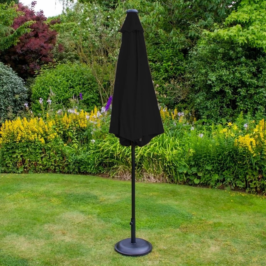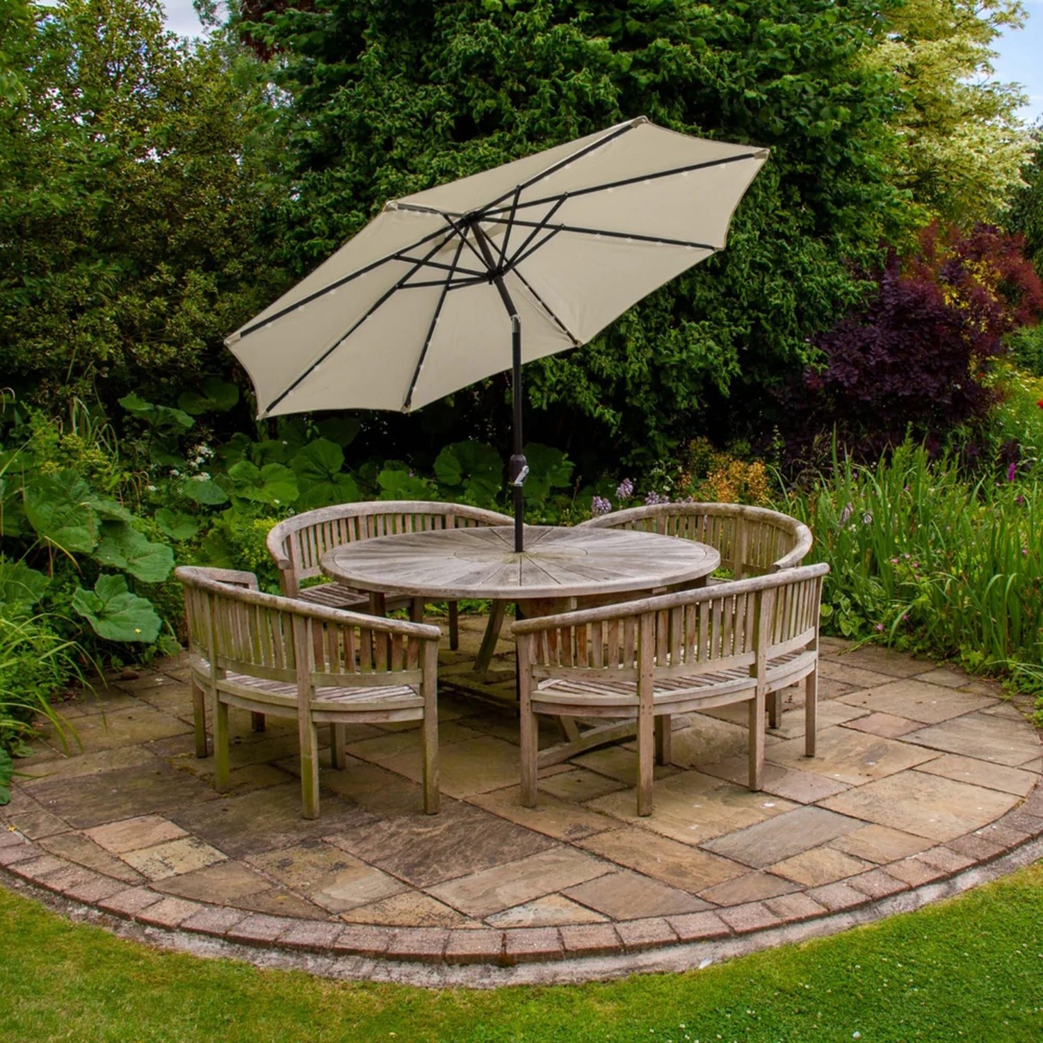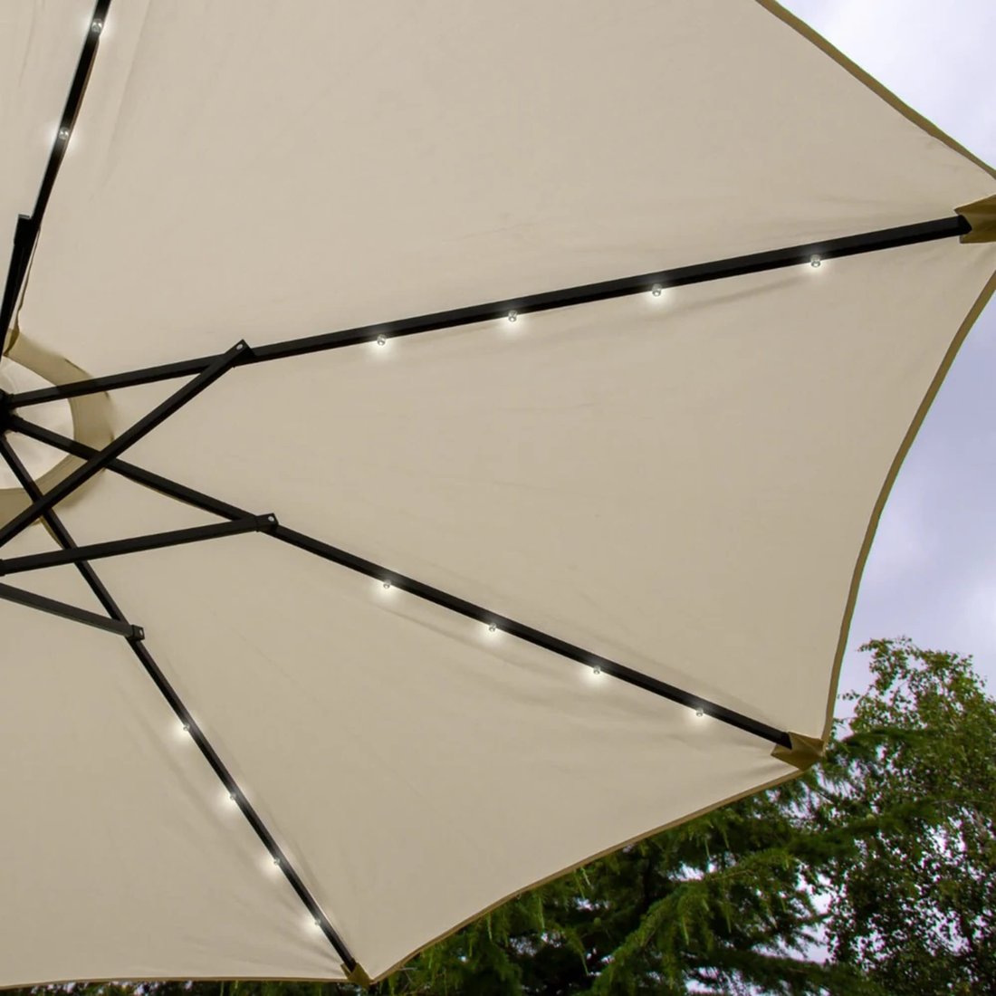 The Lichfield Cream 2.7m Tilt Parasol with LEDs ia an innovative parasol that caters to your every need. Effortlessly tilt it to your desired angle for optimal coverage or rotate it a full 360 degrees for unparalled shading control, accompanying the sun's movements throughout the day. Its sleek central pole design fits right into your patio table, transforming it into an enchanting centrepiece for alfresco dining or garden parties. For your comfort, a discreet ventilated canopy ensures excellent airflow while enhancing stability by reducing wind pressure.