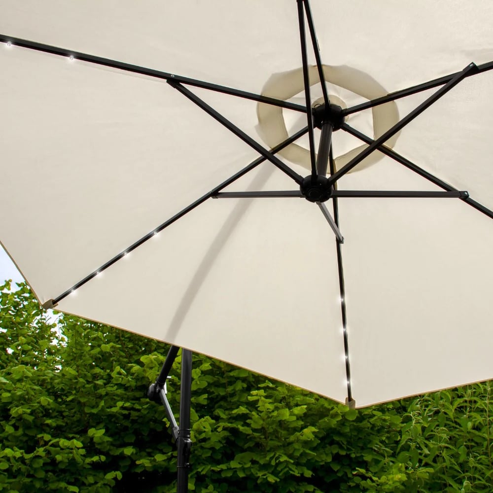 The ribs of the Cream 3 metre Lichfield Cantilever Parasol are adorned with four splendid cool white LED lights, drawing power from the sun, keeping your evening gatherings beautifully lit in an eco-friendly and cost-effective manner. A simple on/off switch affords rapid lighting when you're eager to prolong your outdoor relaxation. Constructed with durable powder-coated carbon steel and a robust 48mm thick pole, our parasol promises longevity. In addition, we provide a complimentary waterproof rain cover for year-round protection. While the cantilever stands freely due to its cross-section bottom, we recommend pairing it with our Optional Bases for added security.