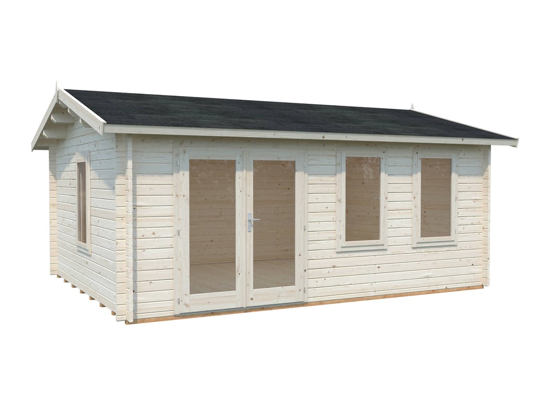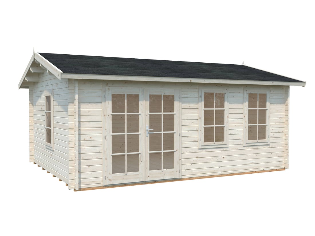The Palmako Iris 19.1m² Log Cabins 44mm thick wall construction is extremely sturdy, and the Double Locking Door and wide Double Glazed Windows allow plenty of light inside. The 19mm thick floor and 19mm Thick Roof are built to take the weight of many a social gathering and all of this is backed up by a 5 Year Warranty.