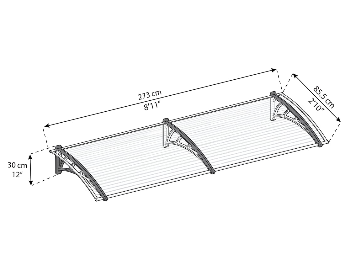The Palram- Canopia Neo 2700 Door Canopy is the perfect solution for those looking to decorate their doorways and porch areas while also protecting them from harsh weather conditions. The virtually unbreakable, 6 mm twin-wall polycarbonate panel of the Neo not only filters damaging UV rays but also gives a pleasant, diffused light.