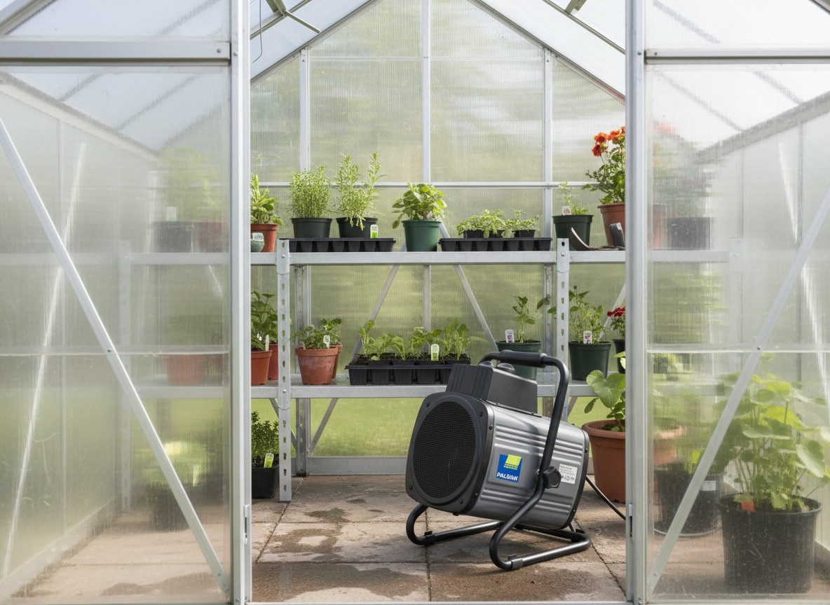 The Palram Canopia 2400W Greenhouse Heater delivers 8600 BTU through a low-noise fan, covering greenhouses up to 14 square metres. The separate digital thermostat uses two independent sensors for accurate temperature readings. IPX4 splash resistant and CE certified for greenhouse use.