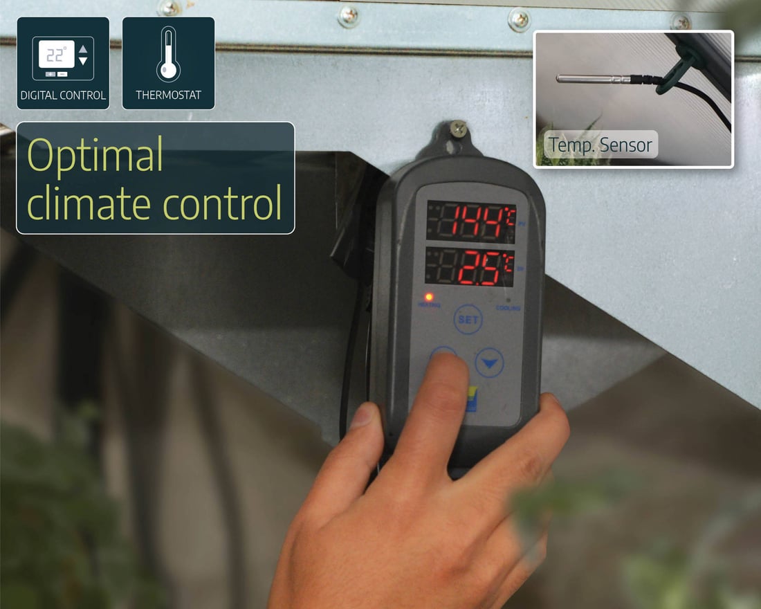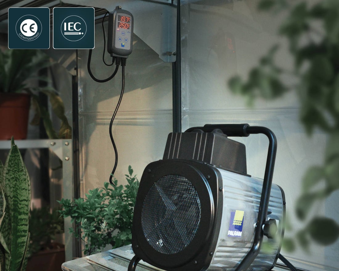 What sets this heater apart is the external digital thermostat. You mount the thermostat controller away from the heater, closer to your plants, so it reads the actual growing temperature rather than the warm air right next to the fan. Two sensors cross-check each other for accuracy. Set your target and the heater cycles on and off to hold it.