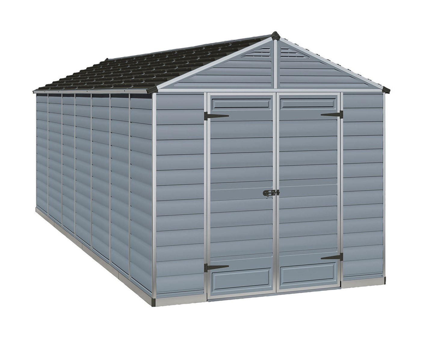 The Palram - Canopia 8 x 16 Plastic Skylight Grey Shed is made from tough shatterproof polycarbonate and has a unique roof that looks solid yet lets light in during the day.