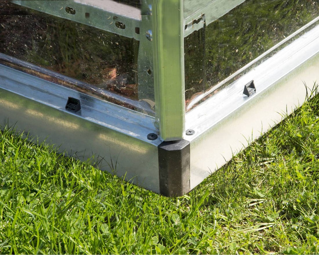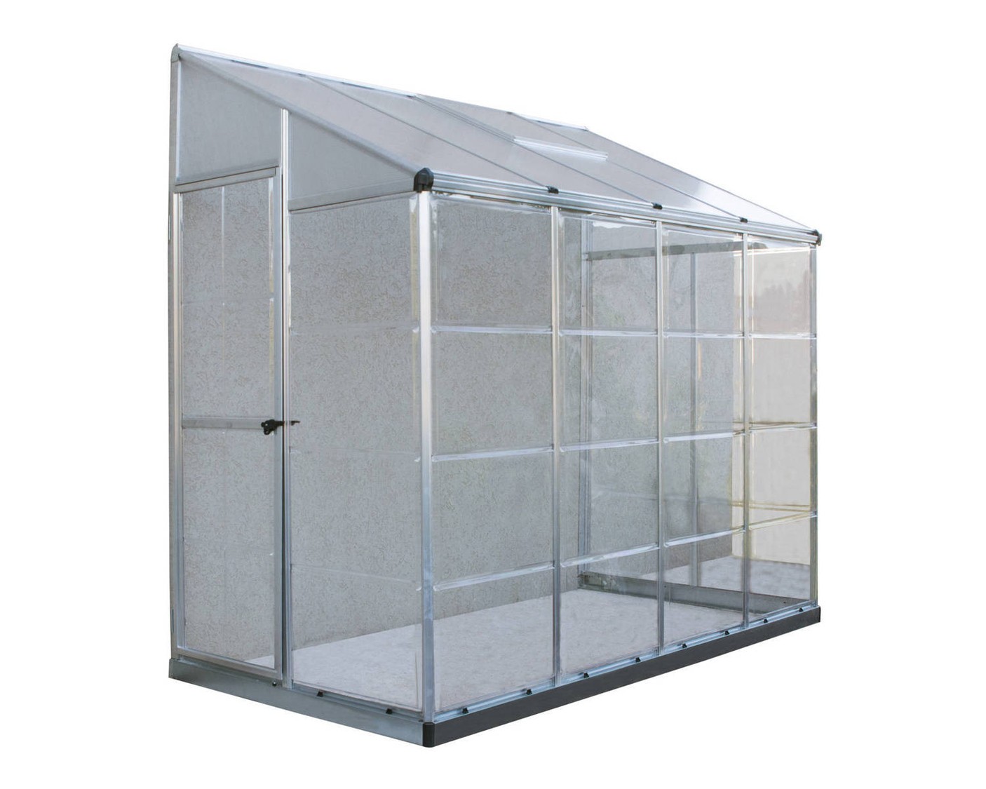 The Palram Canopia 8x4 Lean to has an aluminium frame and a silver aluminium base plinth that's nice and solid and won`t ever require any maintenance. The side glazing is Palram Canopias famous Crystal Clear Polycarbonate that is completely shatterproof, tough, and above all, safe. This glazing gives a superb 90% light transmission along with being 100% UV protected which means the panels won`t go yellow over time but will stay lovely and clear ! The roof glazing is Twin Wall Polycarbonate to help retain heat and also protect plants from the Sun.