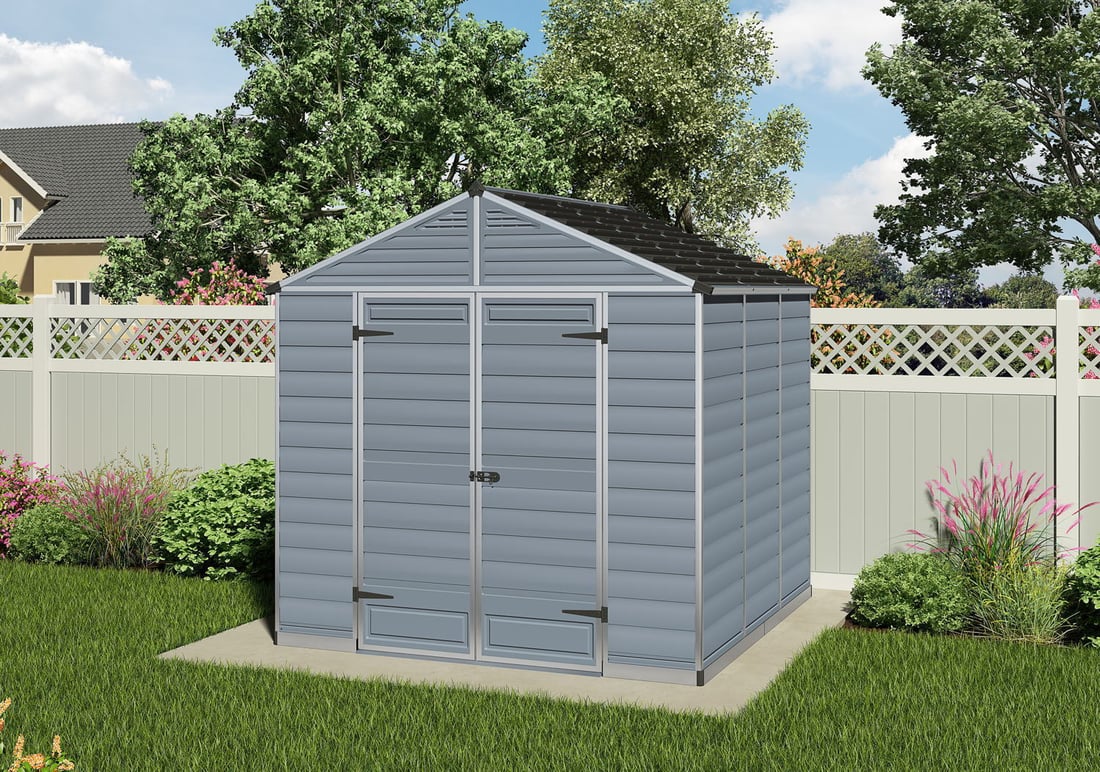 The Palram - Canopia 8 x 8 Plastic Skylight Grey Shed is made from tough shatterproof polycarbonate and has a unique roof that looks solid yet lets light in during the day.