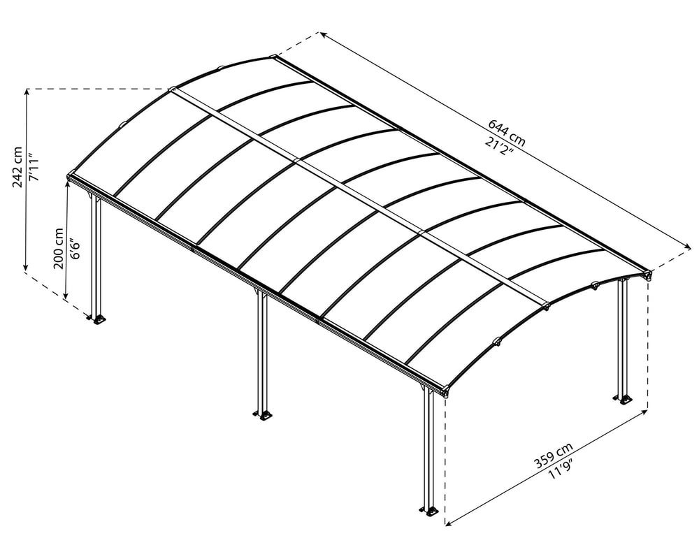 The Palram - Canopia Arcadia 6400 Carport features extra robust powder coated Aluminium construction through out to protect your car, patio set or even your jacuzzi! It's generous height means you can fit even the tallest 4x4 under cover.