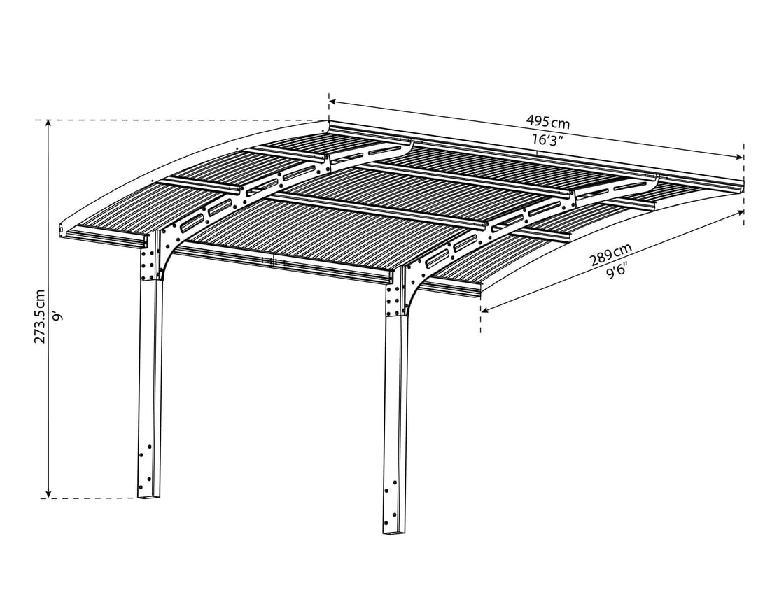 This Palram - Canopia Arizona 5000 Wave 9x19 Gazebo is complete with guttering to channel water away. Simple 2 man construction makes it a simple solution for your drive way or garden. You will need concrete footings to install the canopy