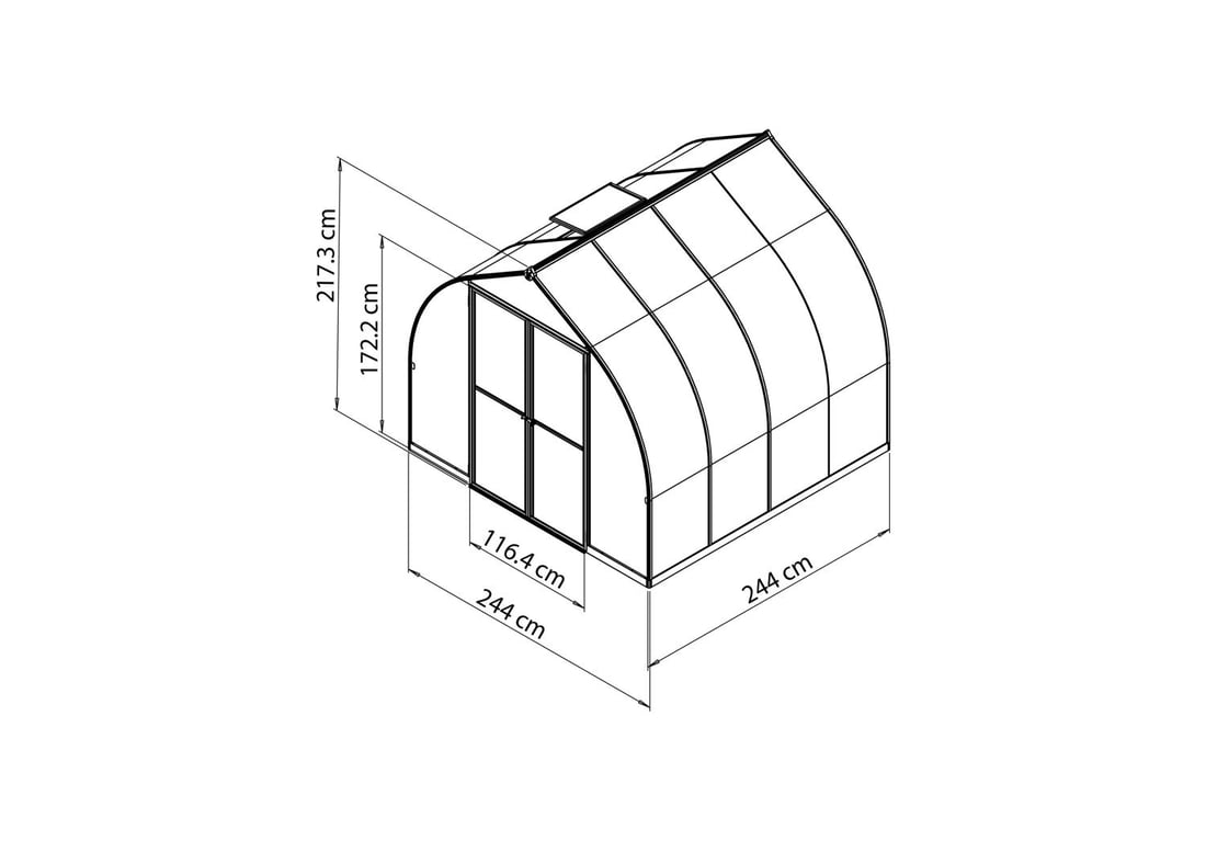 This Palram - Canopia Bella 8x8 has an opening roof vent, an outward locking opening door and an aluminium base.