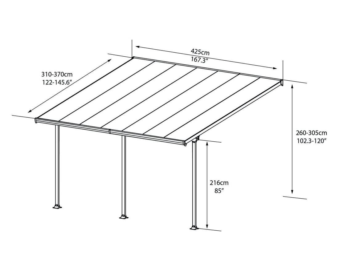 The New Palram - Canopia Feria 4m x 4m Patio Cover is available in 2 Lengths and can be adjusted to suit most patio sizes. Equally at home providing cover for you and you garden furniture as it is being used as a car port.