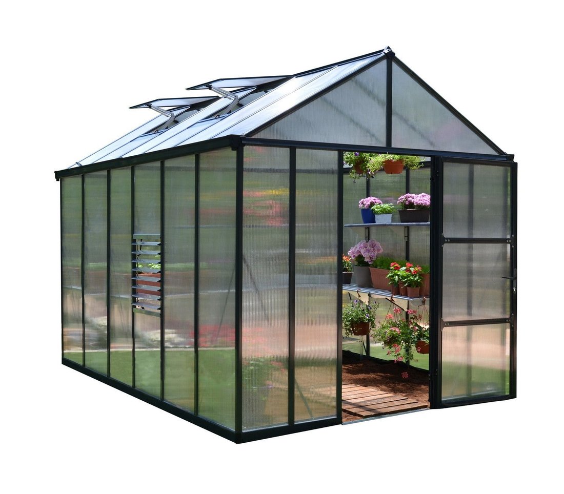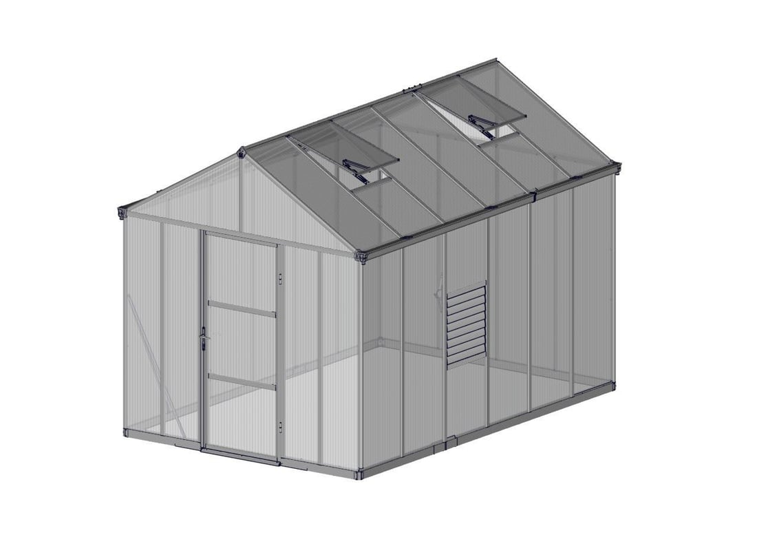 This Palram - Canopia Glory 8x12 has two opening roof vents and one Louvre vent for ventilation, an outward locking opening door, aluminium base and integral gutters.