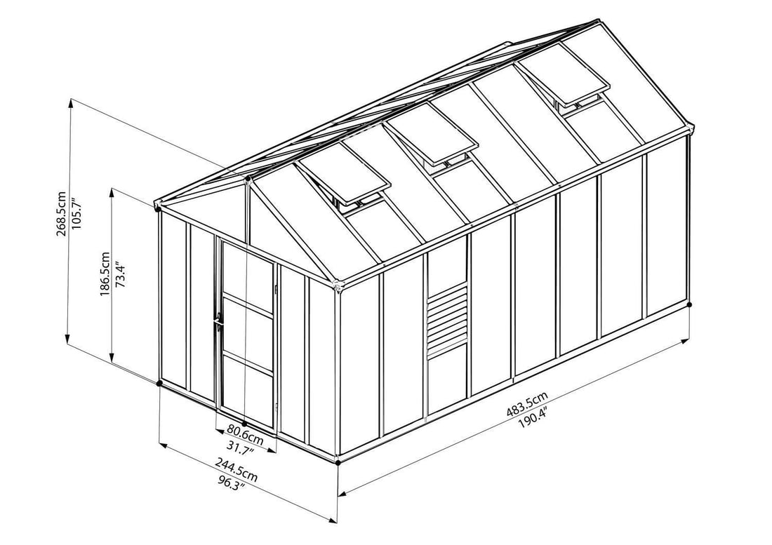 This Palram - Canopia Glory 8x16 has three opening roof vents and one Louvre vent for ventilation, an outward locking opening door, aluminium base and integral gutters.