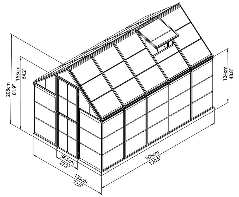 This Palram Canopia Harmony 6x10 has a single opening roof vent for ventilation, an outward opening door, aluminium base and integral gutters.