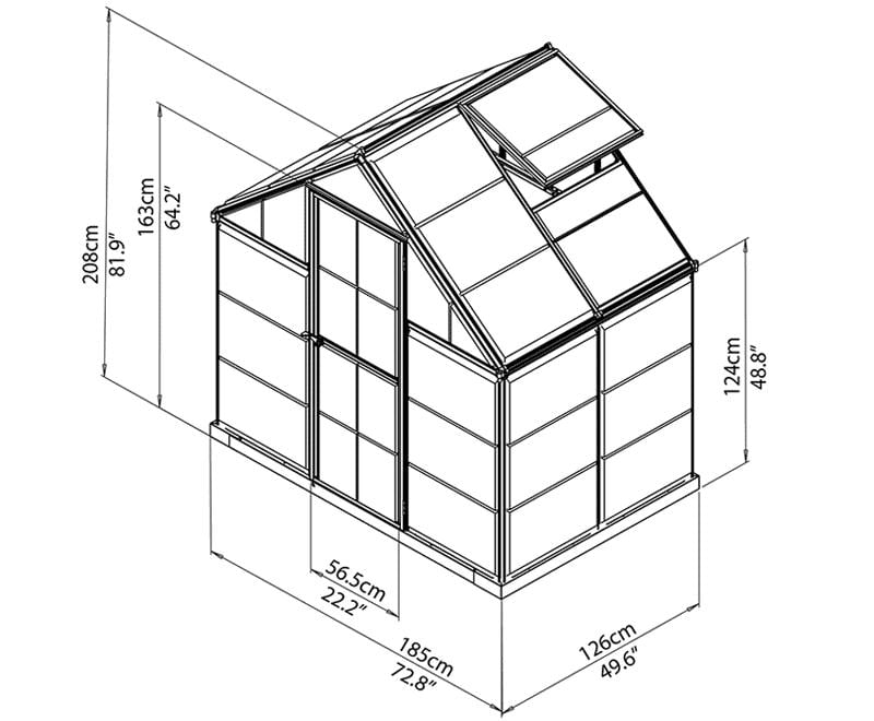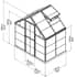 This Palram Canopia Harmony 6x4 has a single opening roof vent for ventilation, an outward opening door, aluminium base and integral gutters.