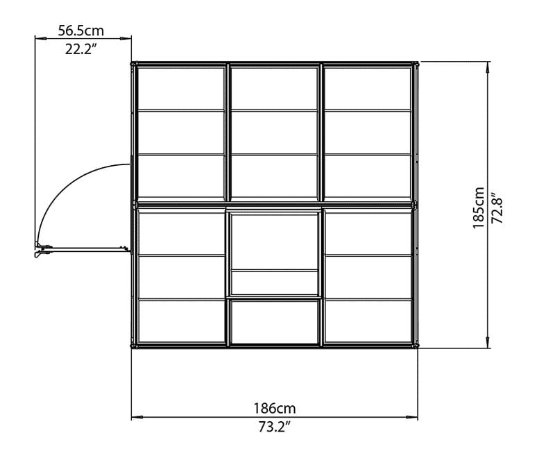This Palram Canopia Harmony 6x6 has a single opening roof vent for ventilation, an outward opening door, aluminium base and integral gutters.