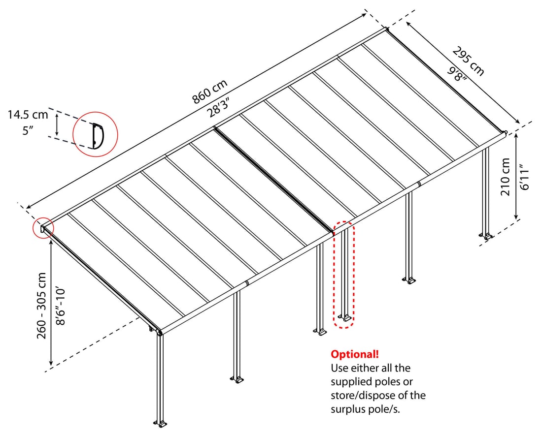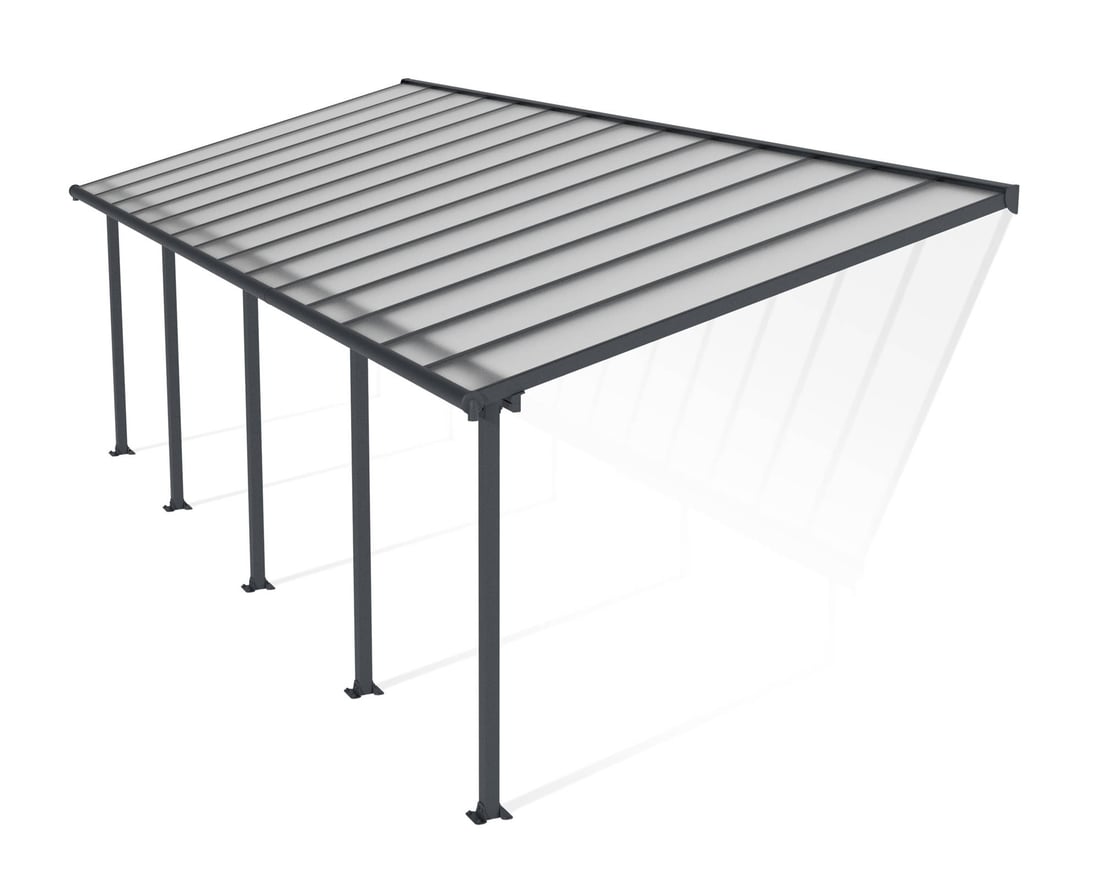 The Palram - Canopia Olympia 3m x 8m Patio Cover Grey has a versatile design with adjustable legs and pitch so it can be made to fit most garden and patio areas. This versatile canopy can be used to provide cover for you and you garden furniture as well as being used as a car port.