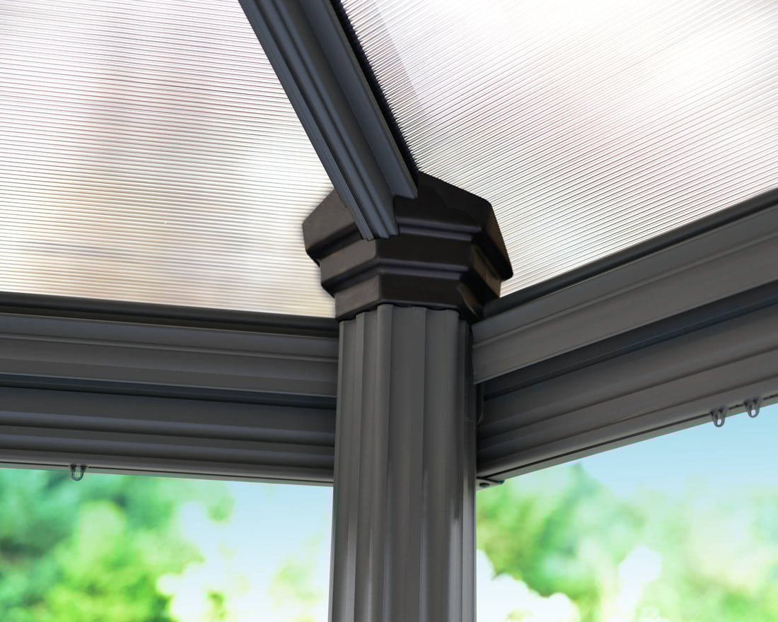 The Roma 11ft x 13ft gazebo is constructed from powder coated aluminium and features UV protected 6mm Polycarbonate to keep you and your loved ones safe from harmful UV rays.