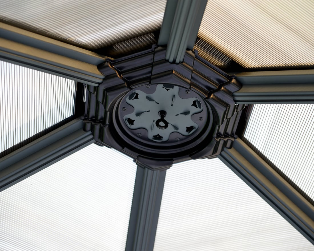The Palram - Canopia Roma Hexagonal Gazebo makes an excellent focal point for your garden and makes an ideal area for entertaining friends. Ventilation in the 6mm Polycarbonate roof makes it ideal for barbecues and jacuzzi's.