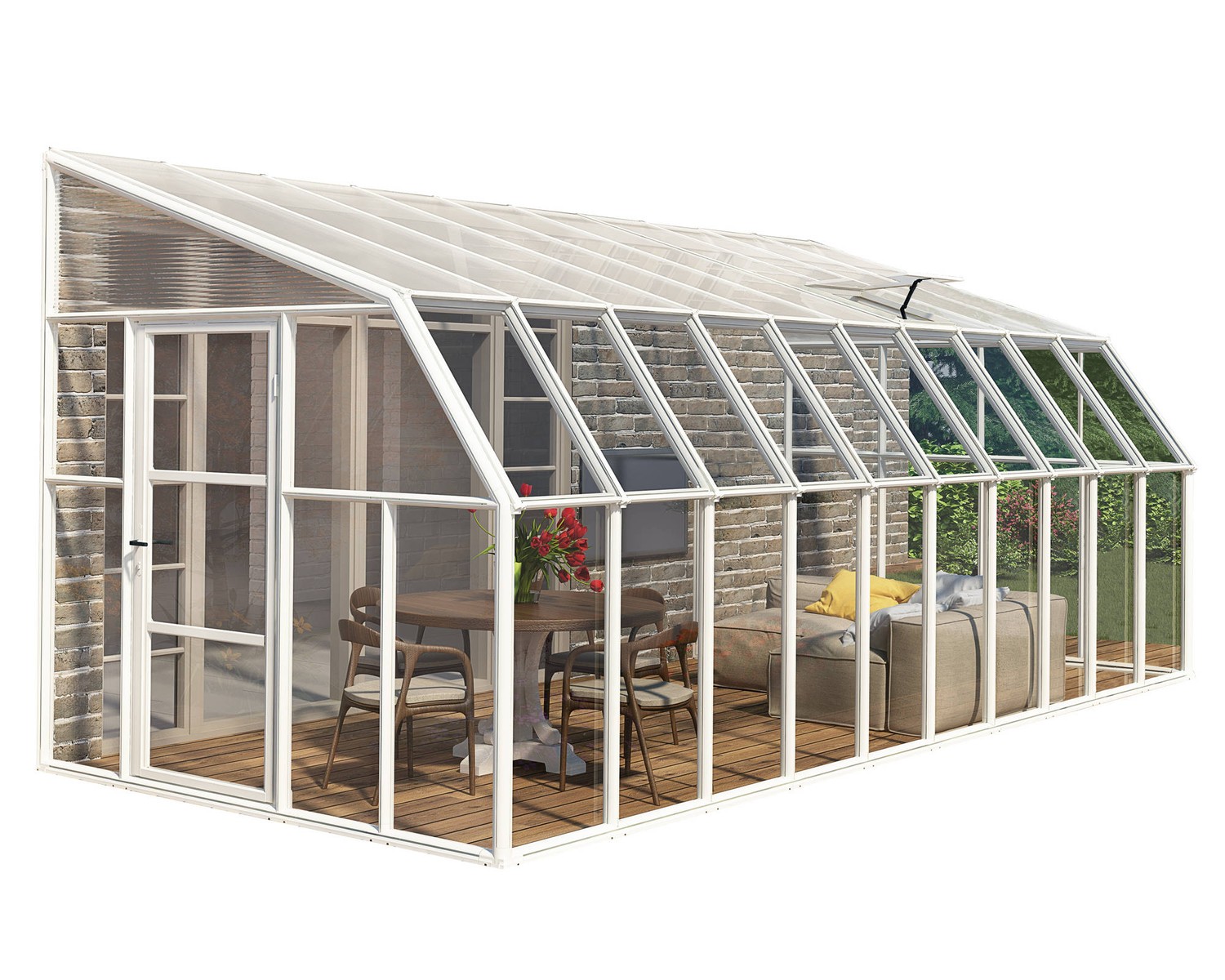 The Palram - Canopia Sun Room 8 x 20 Lean to Greenhouse is tough and ideal for the UKâs often blustery, wet weather. The Sun Room is perfect for adding more space to your house for relaxing in and growing plants.
