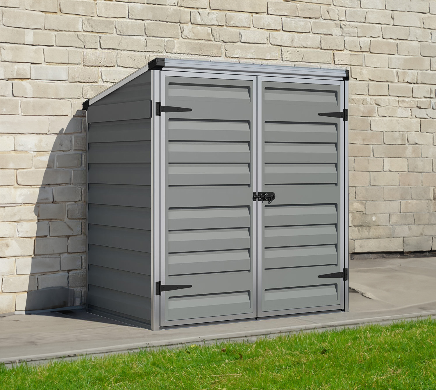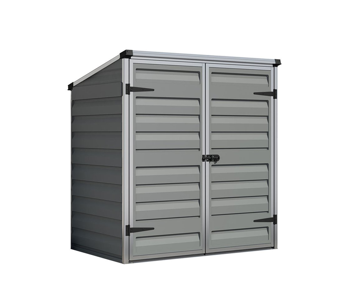 The Palram - Canopia Voyager 4x3 Plastic Storage Unit Grey is made from shatterproof polycarbonate and has a unique pent roof that looks solid yet lets light in during the day.