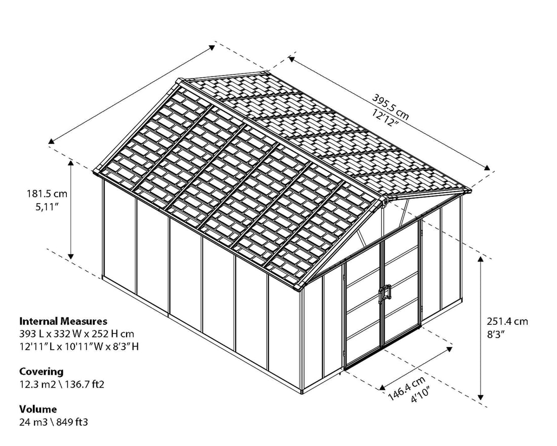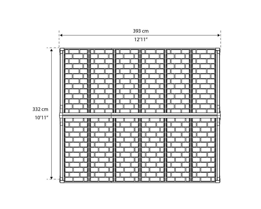 The Palram - Canopia 11x13 garden storage building is made from virtually unbreakable Polycarbonate which is tied into a rust proof Aluminium frame and sits on a Galvanized Steel Perimeter frame which can be fixed down. The shingle styled roof is translucent so it lets light flood into the shed. Also available is an optional heavy duty Wood polymer Composite floor.