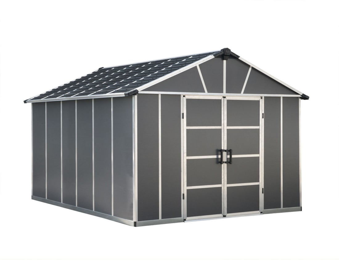 The NEW Palram - Canopia Yukon 11x13 Plastic Shed combines all of the fantastic features of the Skylight range into a much bigger, heavy duty package which comes with a weather resistant Wood Polymer floor!.