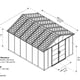 The Palram - Canopia 11x13 garden storage building is made from virtually unbreakable Polycarbonate which is tied into a rust proof Aluminium frame and sits on a Galvanized Steel Perimeter frame which can be fixed down. The shingle styled roof is translucent so it lets light flood into the shed. Also available is an optional heavy duty Wood polymer Composite floor.