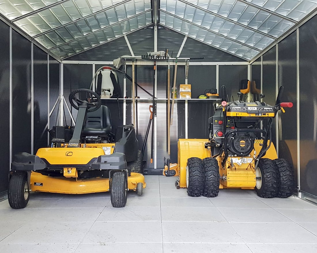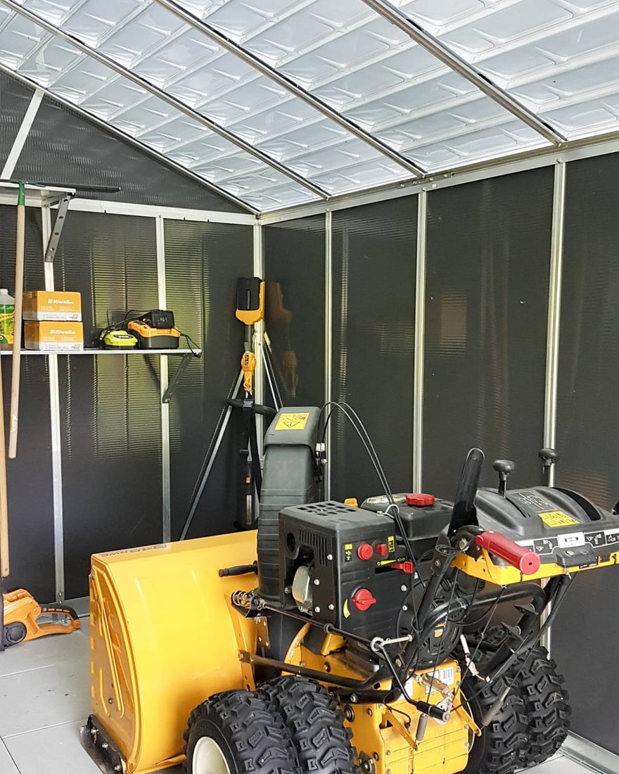 The Palram - Canopia11x21 garden storage building is made from virtually unbreakable Polycarbonate which is tied into a rust proof Aluminium frame and sits on a Galvanized Steel Perimeter frame which can be fixed down. The shingle styled roof is translucent so it lets light flood into the shed. Also available is an optional heavy duty Wood polymer Composite floor.