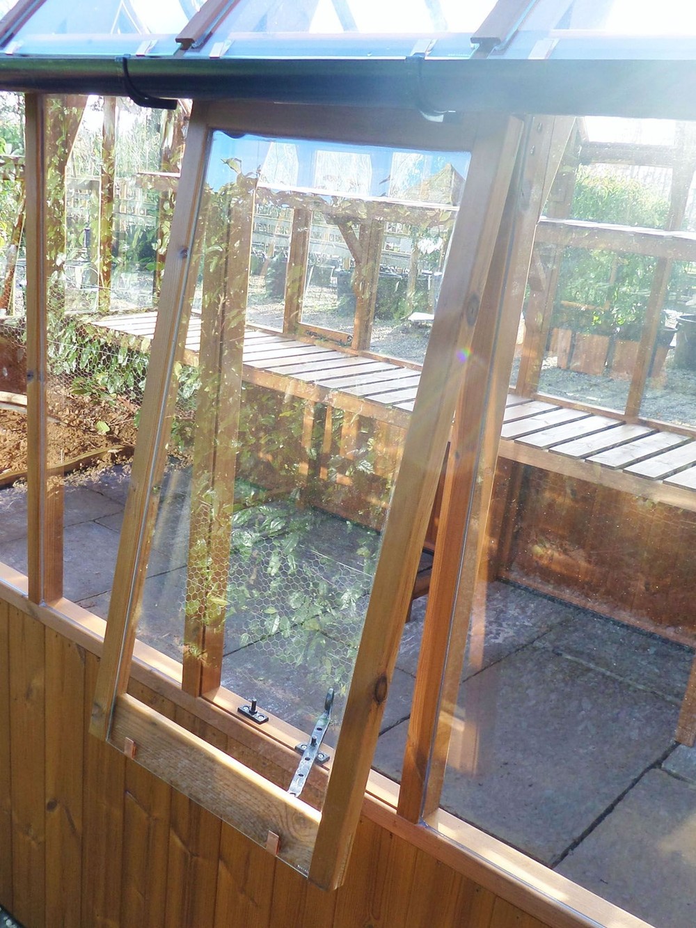 20mm black PVC section screwed to the bottom of the greenhouse stops damp rising into the timber.