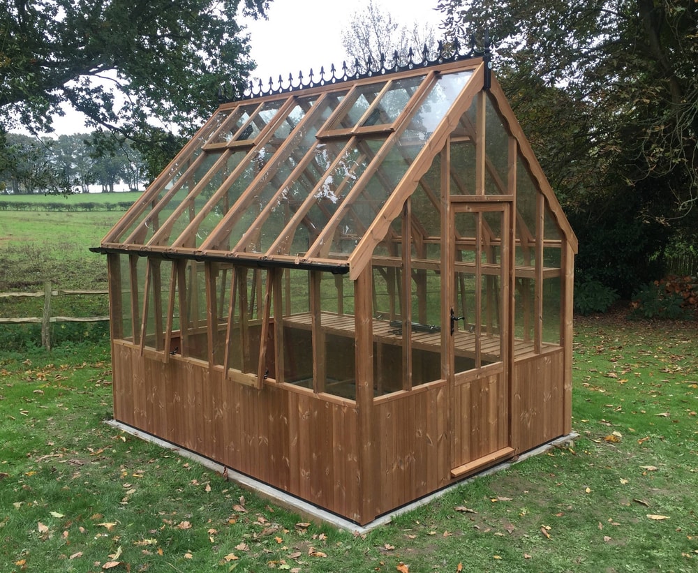 Wooden Greenhouses are very heavy, so the base needs to be solid! We recommend a base of either concrete or well-laid slabs. However, for smaller greenhouses, decking can also be a good option. If you want soil inside your greenhouse, you can make a perimeter base from bricks laid onto concrete footings.