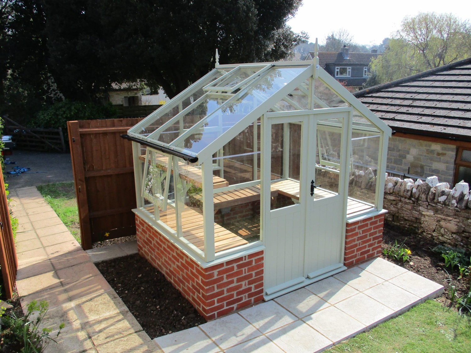 Order this Greenhouse customised to sit on a brick dwarf wall. Select this option and we’ll send you a wall plan to give to your brick layer to complete your wall. We’ll then install a version of this greenhouse with a window sill straight onto the wall.