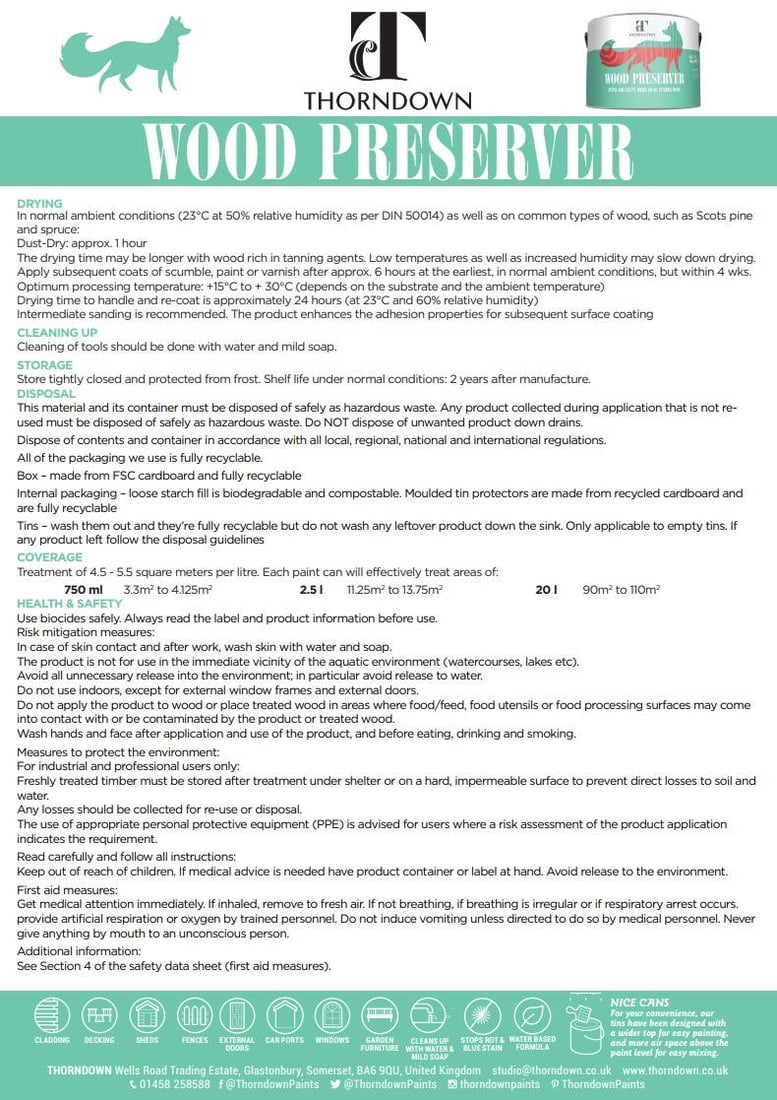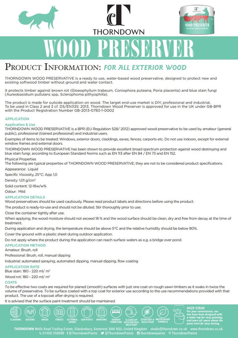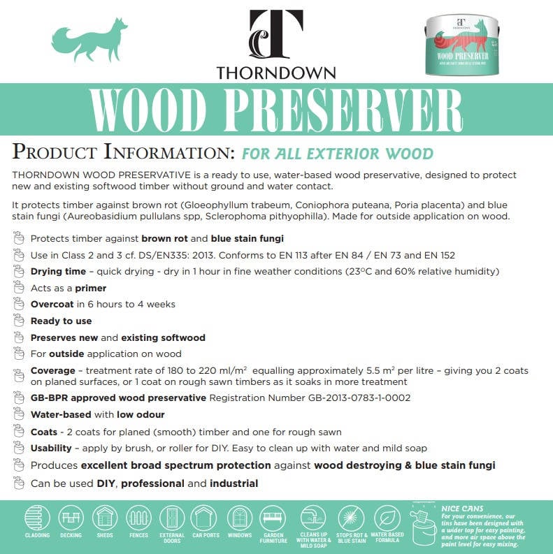 The Thorndown Wood Preserver Clear 2.5L is the perfect solution for all of your timber preservation needs. This Low Odour water-based preserver offers excellent broad-spectrum protection against Wood Destroying Brown Rot and Blue Stain fungi.