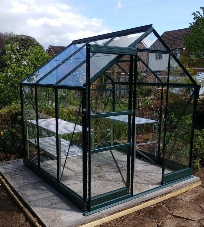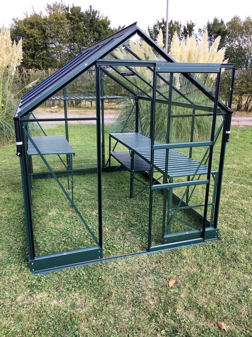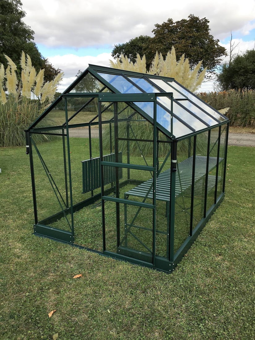 The Vitavia Apollo Green 8x6 Greenhouse with toughened glass is the most widely used size in UK gardens. It`s practical and attractive as it`s green powder coated finish lets it blend into the garden surroundings effortlessly .