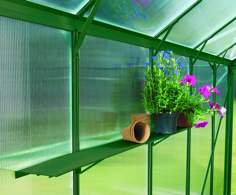 This shelf fixes directly to the greenhouse side. It mounts easily onto the frame structure. It is designed to fit all Vitavia greenhouses. It also fits Halls greenhouse models.