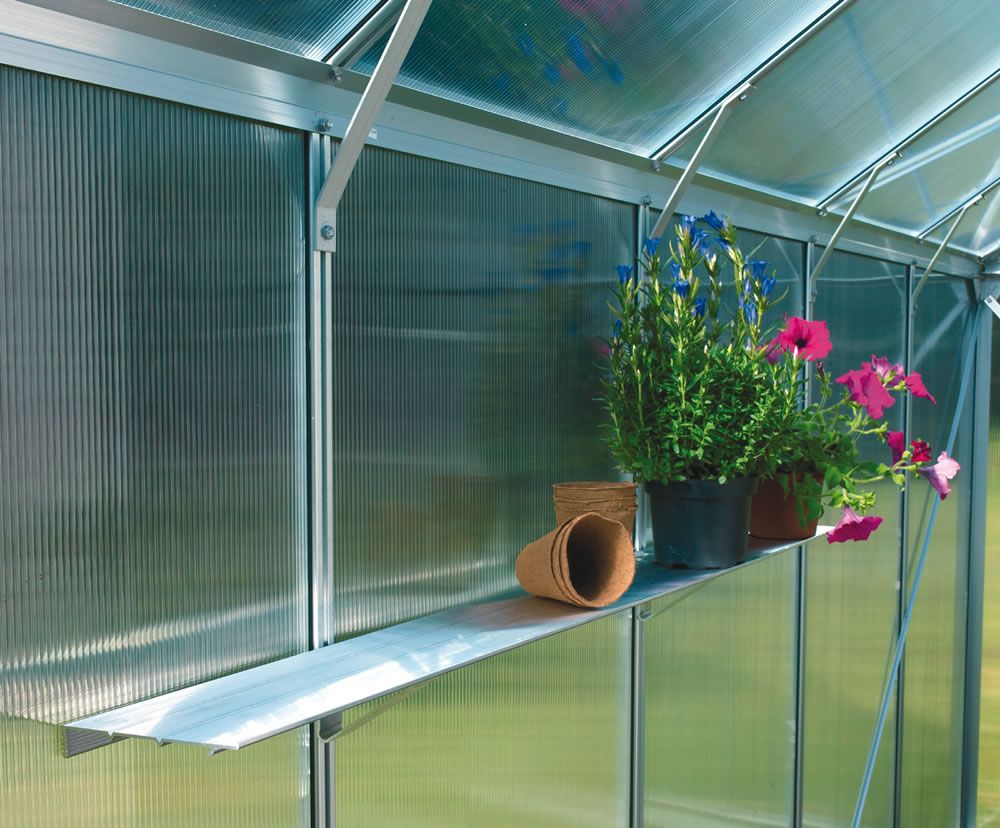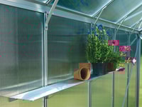 This shelf fixes directly to the greenhouse side. It mounts easily onto the frame structure. It is designed to fit all Vitavia greenhouses. It also fits Halls greenhouse models.