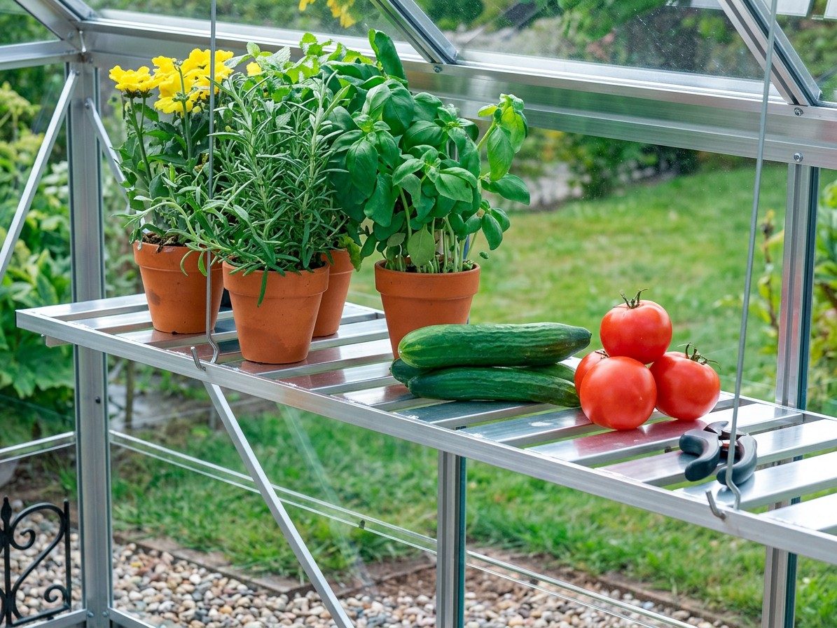 The shelf's clever design allows it to be deployed quickly and just as easily stowed away when not in use. It attaches securely to the greenhouse side and features a simple folding mechanism; when needed, you simply lift it into a horizontal position where it rests securely on its integrated supports or hooks.